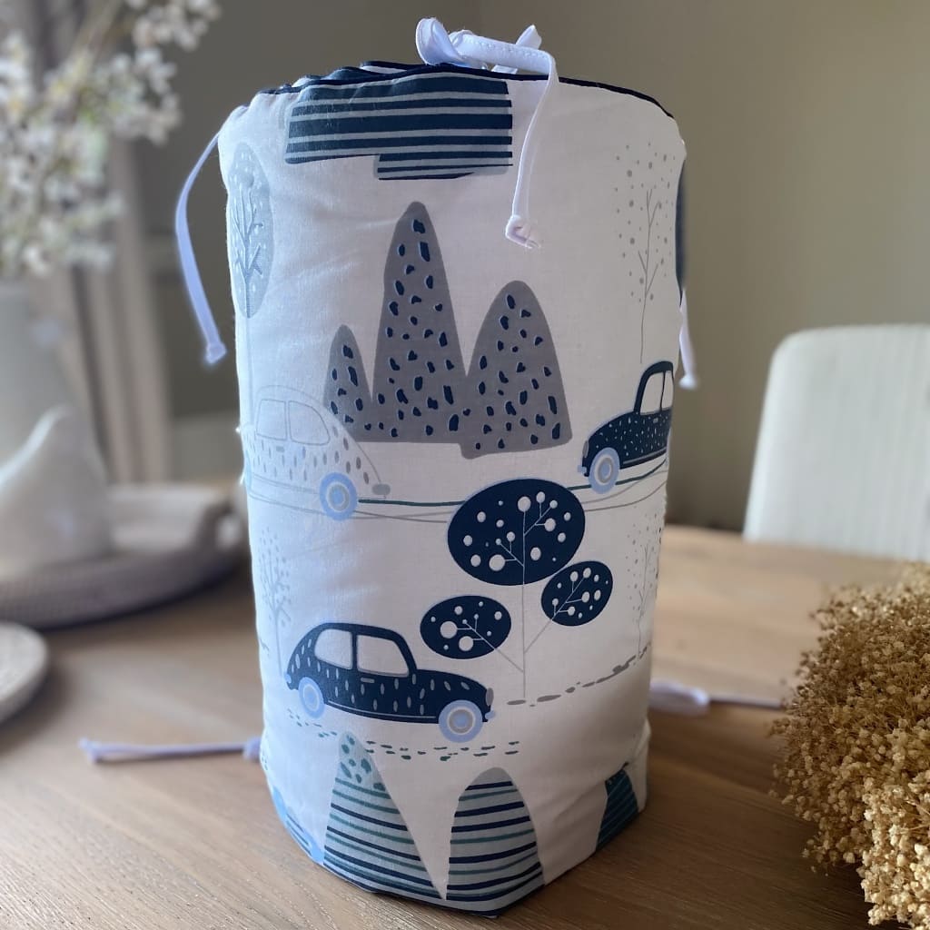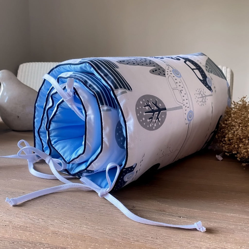 Protect your baby's crib with this cheerful Cot Bed Bumper, featuring a playful cars pattern on one side and soft blue on the other. The reversible design lets you switch between fun and neutral looks to match your nursery mood. Finished with contrasting blue piping for a polished touch, it keeps little ones safe and snug against the rails.